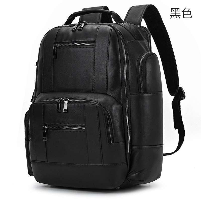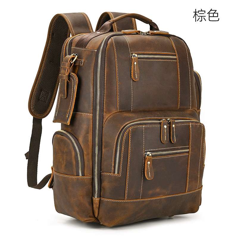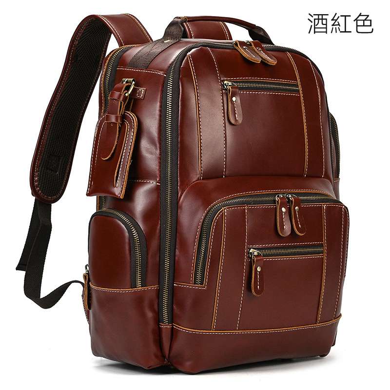 復古多功能多口袋頭層牛皮後背包,大容量旅行包