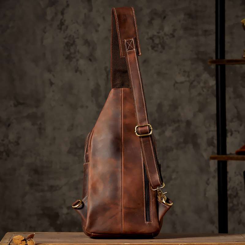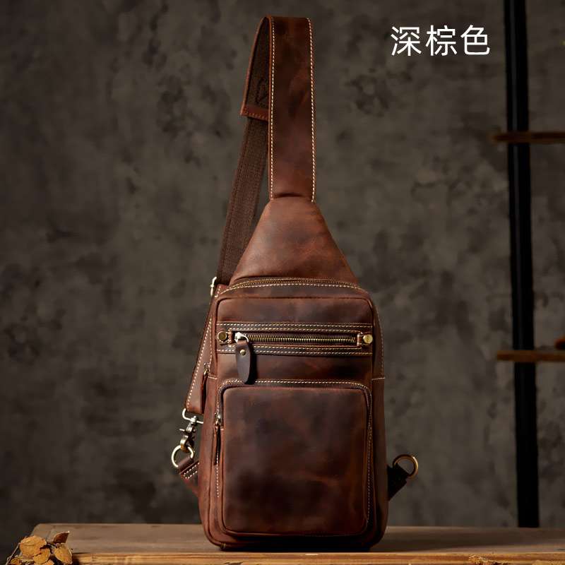 復古瘋馬皮胸包 真皮斜背包 頭層牛皮胸前包