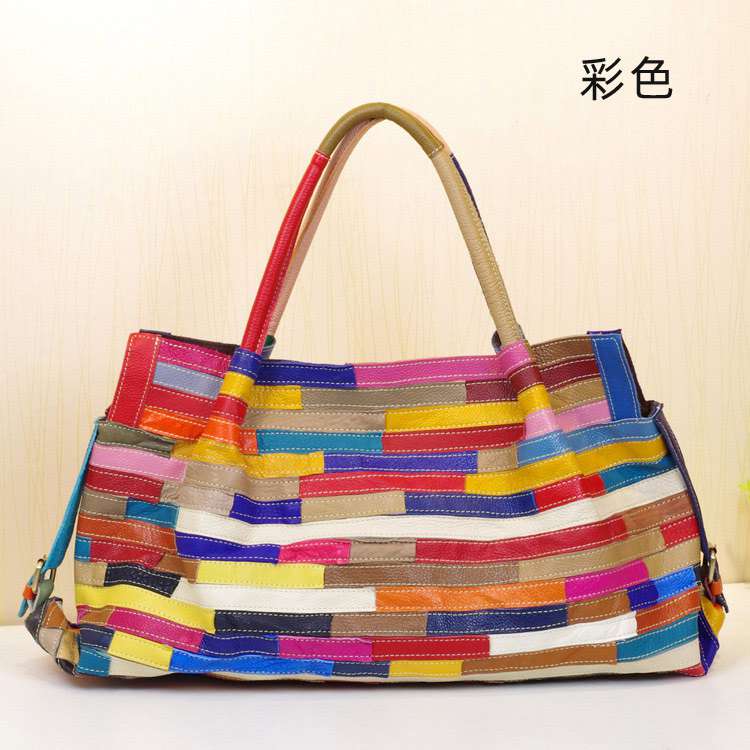 彩色條紋拼接手提包 拼色斜挎包復古手袋