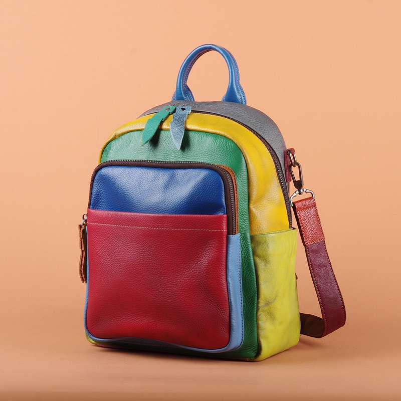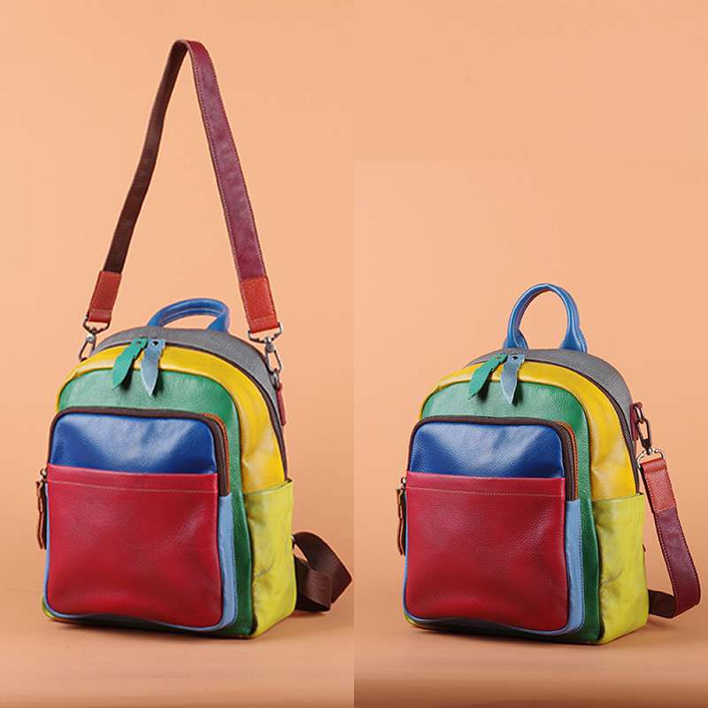 多功能真皮後背包 女生學生書包 旅行背包 復古彩色拼接學生書包