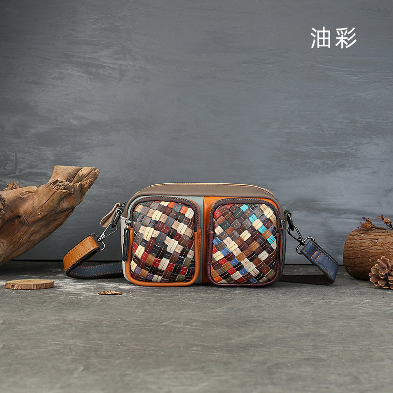 時尚休閑撞色真皮女包 單肩斜挎包 真皮編織拼色相機包