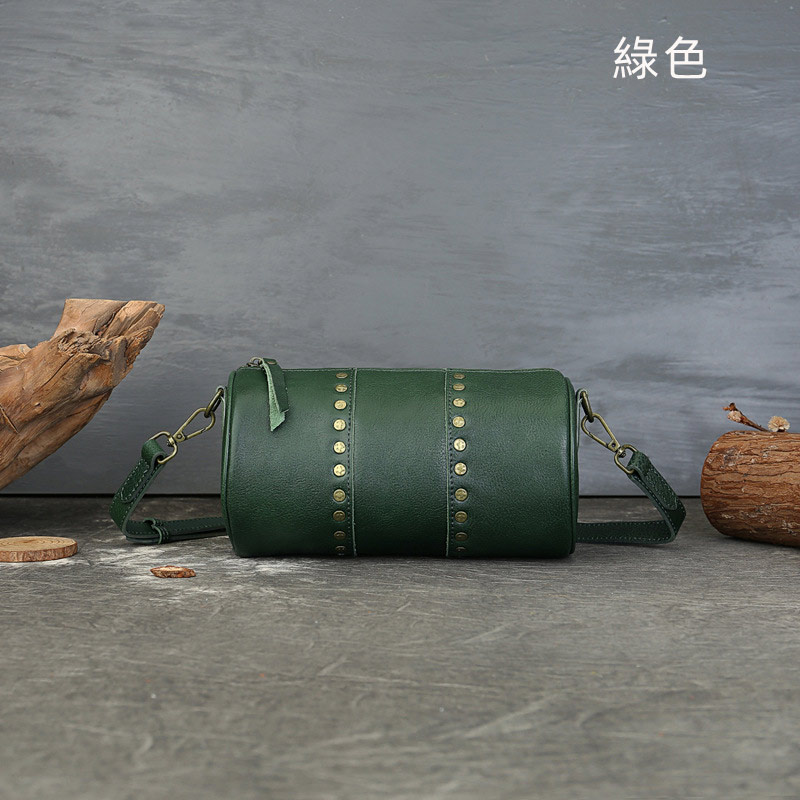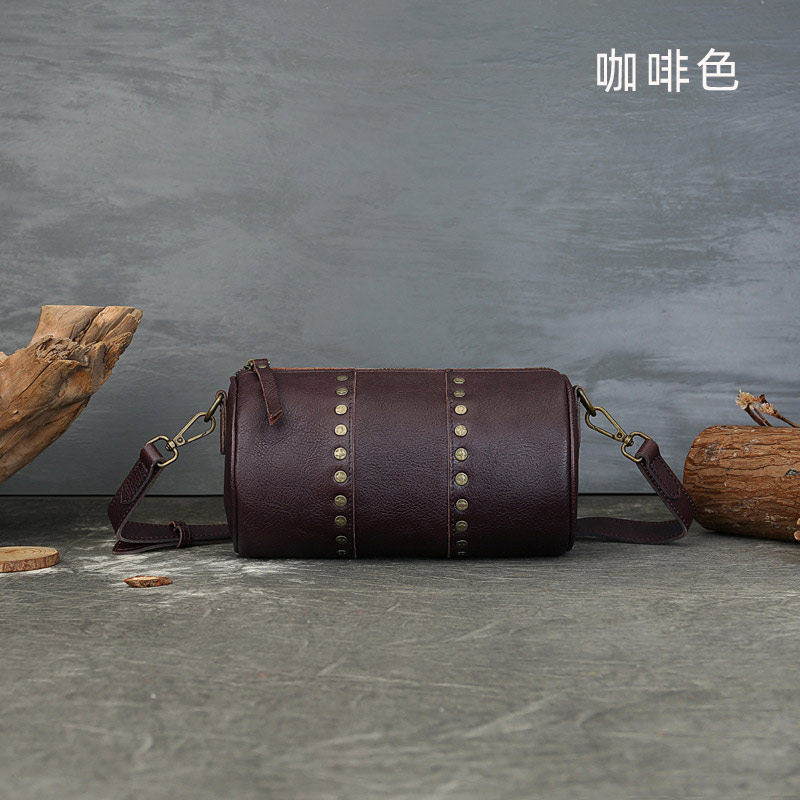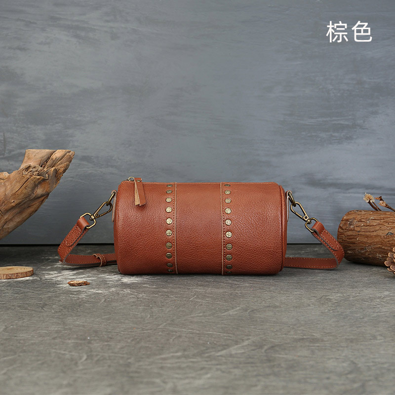 復古枕頭包 真皮包包 新款鉚釘圓筒包 頭層牛皮斜背包