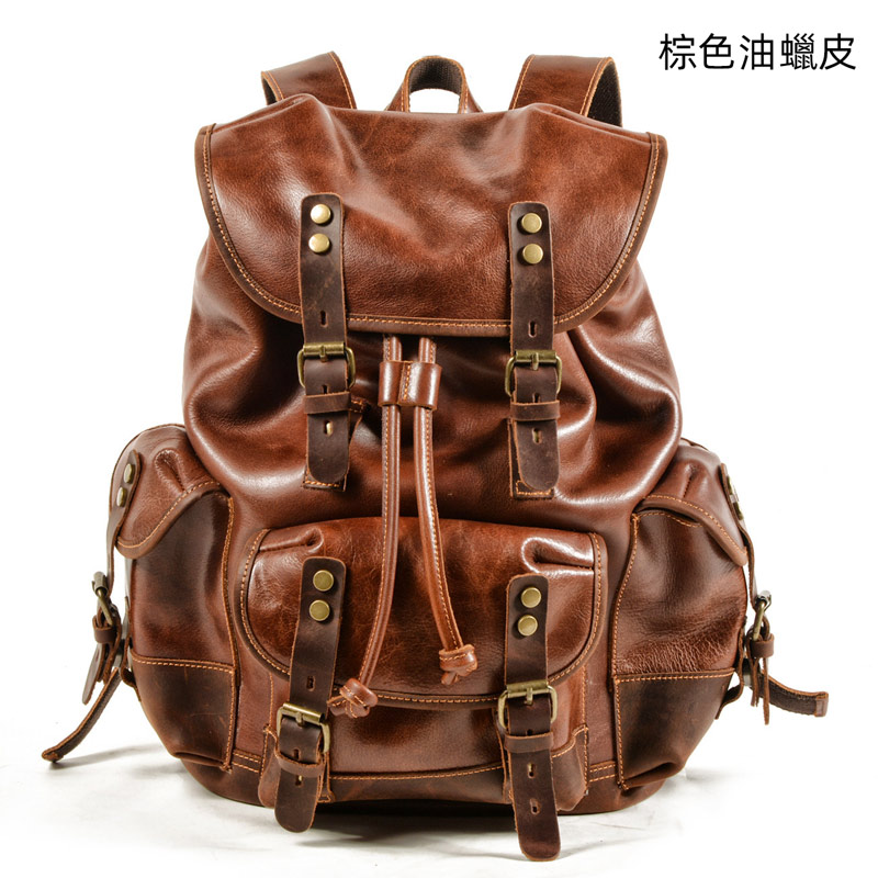 復古束口雙肩後背包 歐美頭層牛皮多口袋雙肩包學生書包