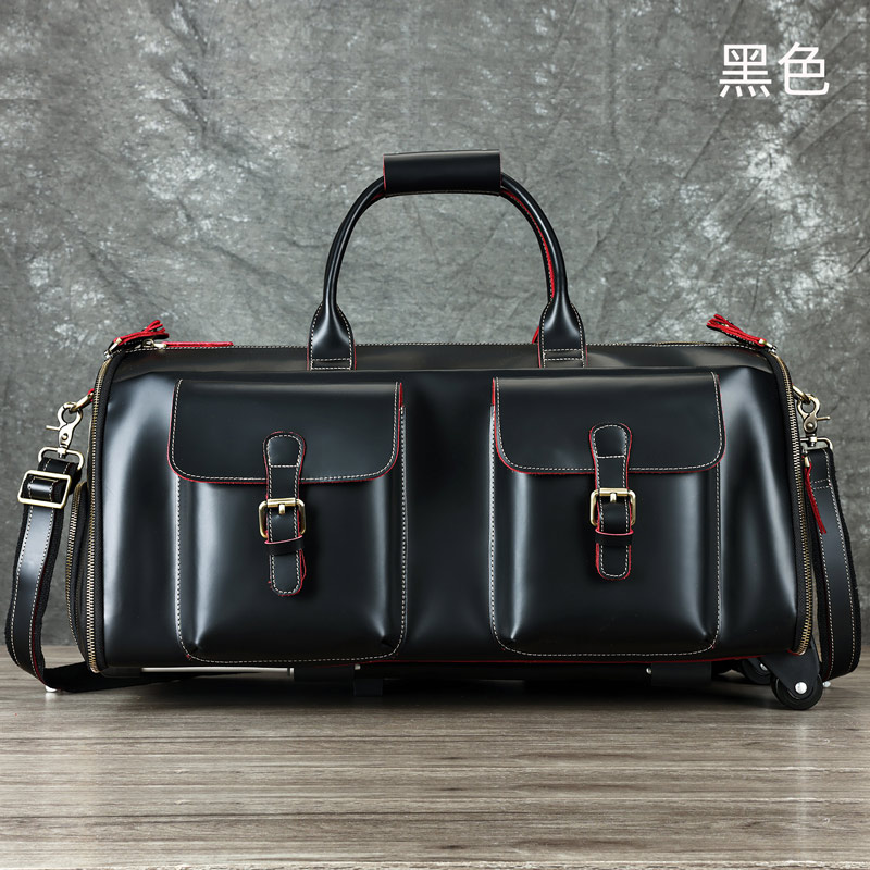 復古帶滑輪大容量瘋馬皮旅行包 男士真皮包包