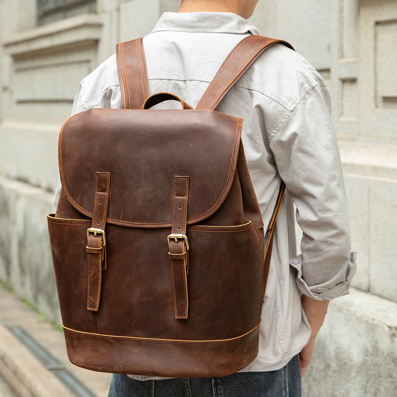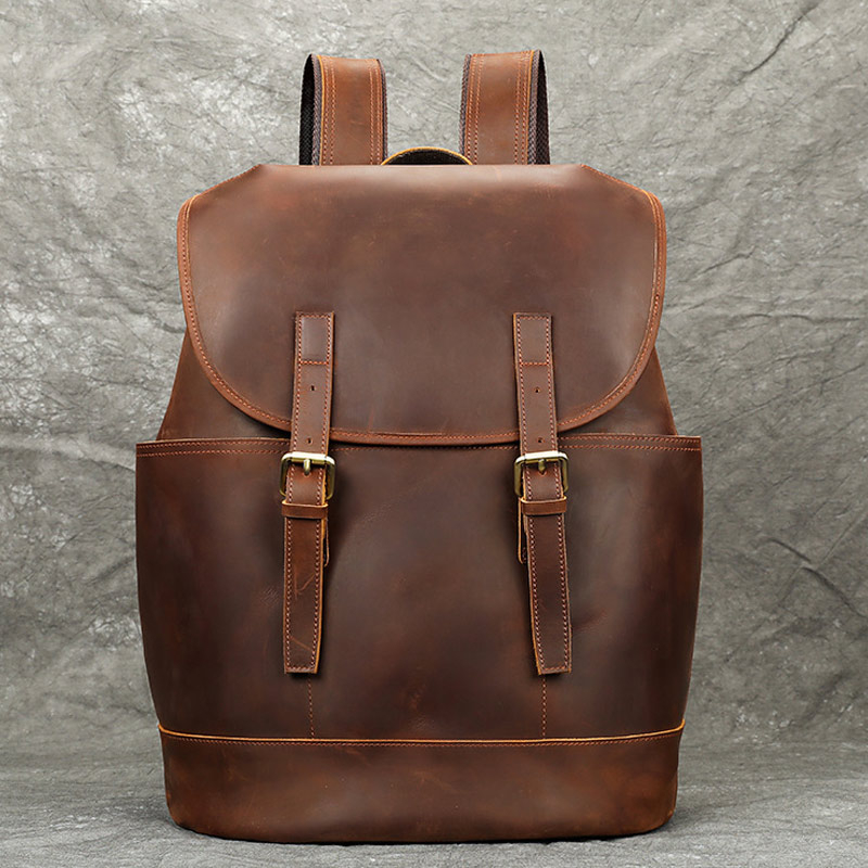 復古大容量歐美頭層牛皮後背包 瘋馬皮旅行包