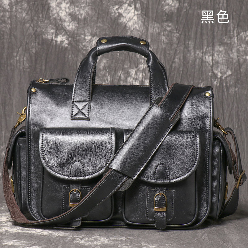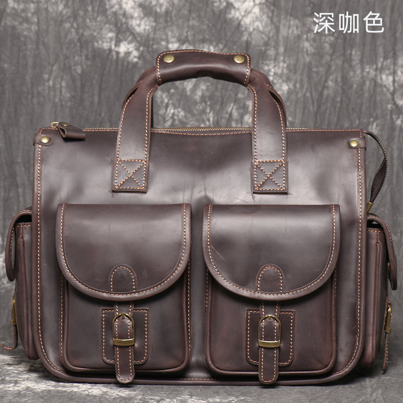 復古厚實頭層牛皮手提包 瘋馬皮商務公事包 男士真皮斜背包